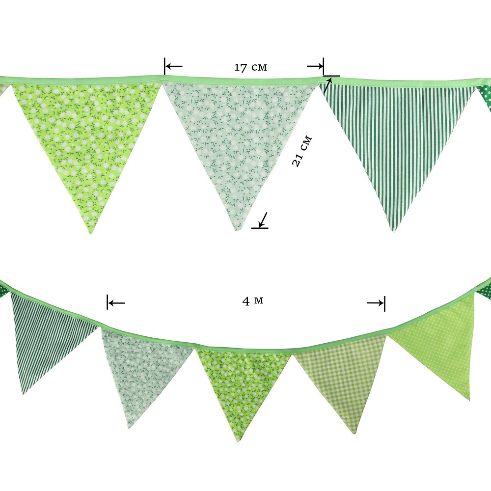 Гирлянда состоит из 12 флажков. Расстояние между флажками - 6 см, общая длина составляет 4 м.