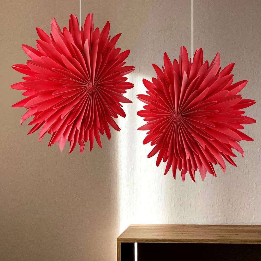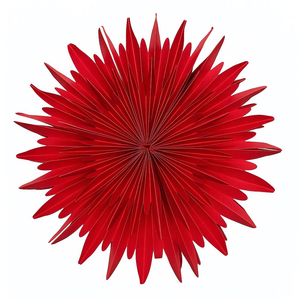 Яркая объемная снежинка из плотной бумаги станет эффектным украшением новогоднего интерьера. Насыщенный красный цвет придаёт праздничное настроение, а изящный узор делает декор лёгким и воздушным.